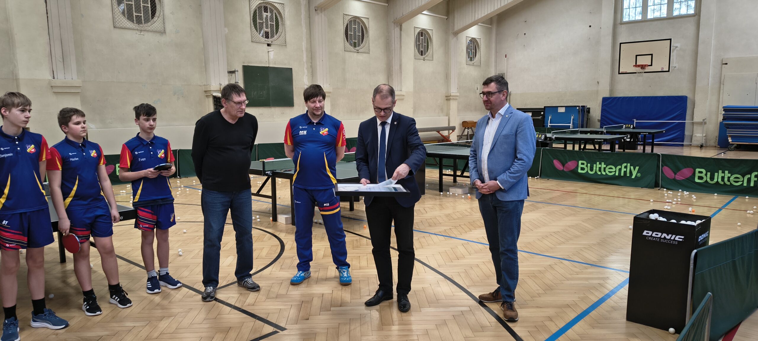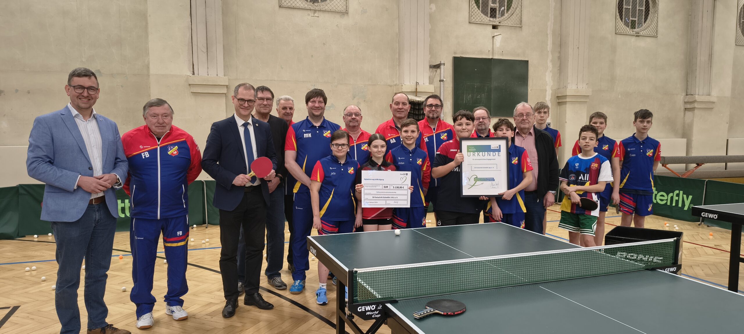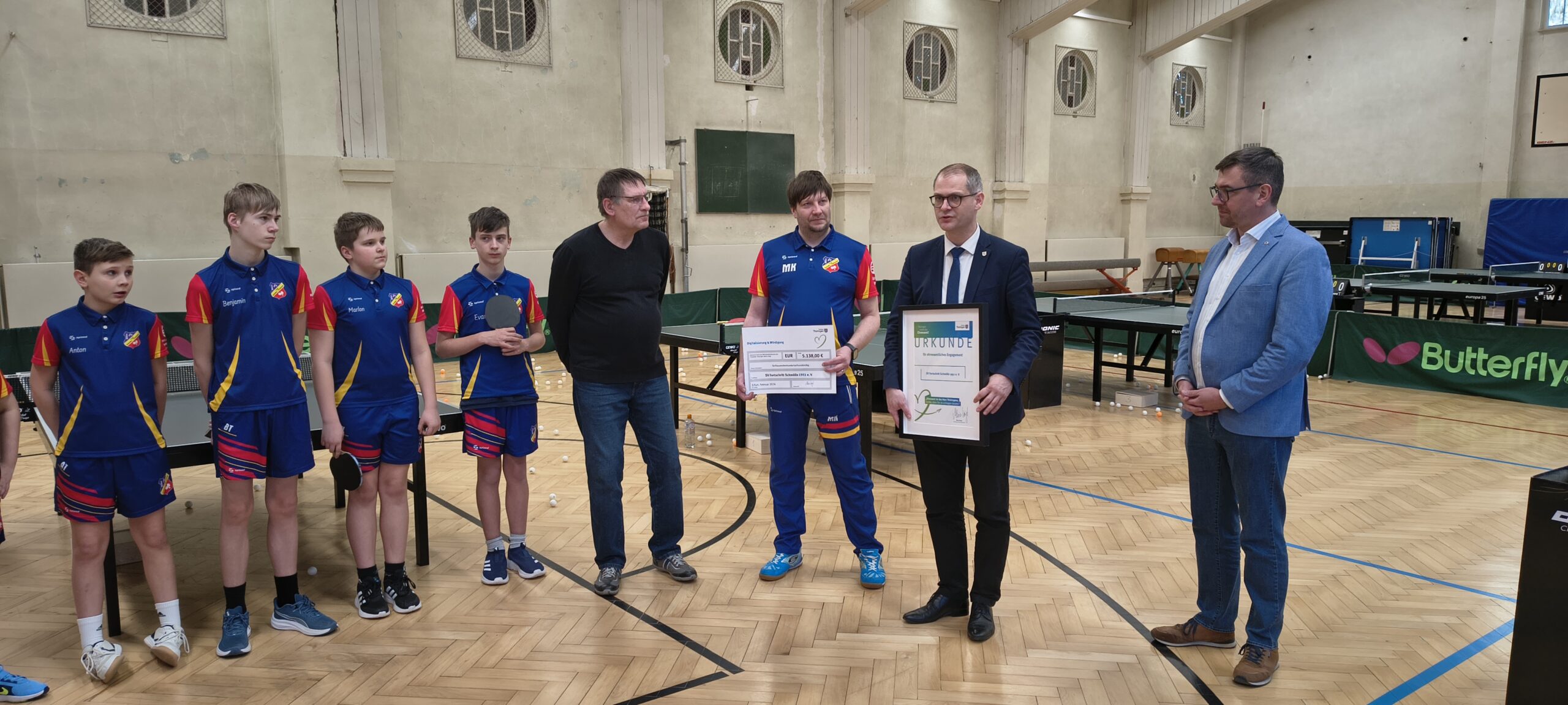 Im Gepäck hatten sie eine großartige Überraschung: einen Fördermittelbescheid über 5.138 € aus dem Programm „Digitalisierung und Würdigung“ 2025. Die feierliche Übergabe fand in unserer Turnhalle statt – begleitet von zahlreichen Vereinsmitgliedern und Nachwuchsspielerinnen und -spielern, die sich riesig über diese Unterstützung freuten.
